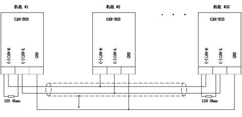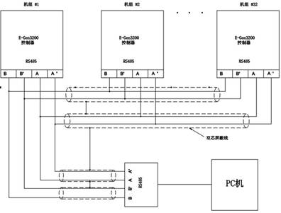 并機(jī)系統(tǒng)中的機(jī)組之間的起停順序、負(fù)載分配、開關(guān)閉合時(shí)間等各種功能都是通過各并機(jī)并網(wǎng)并聯(lián)控制器的數(shù)據(jù)聯(lián)機(jī)進(jìn)行通信,然后由控制器進(jìn)行數(shù)據(jù)處理并發(fā)出相應(yīng)控制命令,從而實(shí)現(xiàn)對(duì)各機(jī)組的并車控制。通信采用 RS-485網(wǎng)絡(luò),其在并機(jī)并網(wǎng)并聯(lián)控制器中的聯(lián)機(jī)示意圖如下: